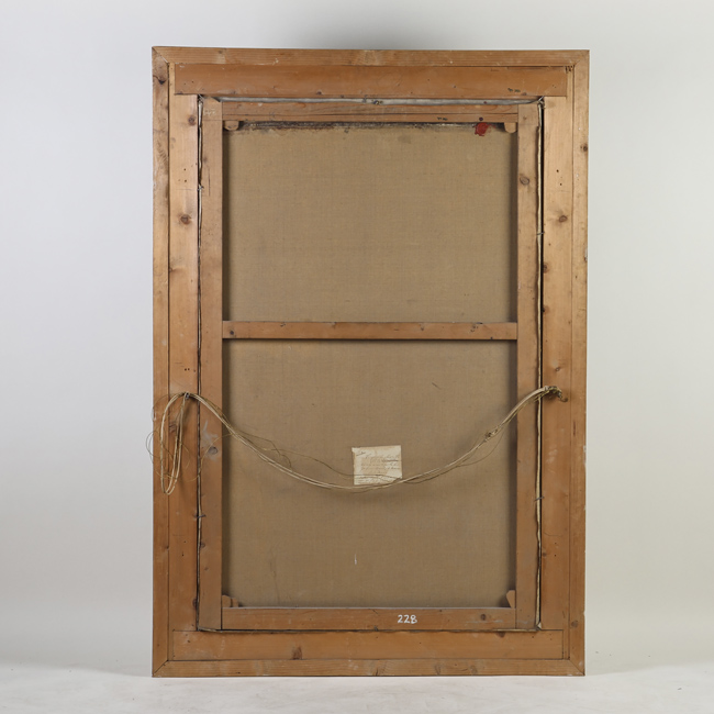 Obra de formato rectangular, disposición vertical. Composición en base a figura femenina sentada, sostiene sobre la pierna izquierda una figura de niño sentado. Viste manto de color ocre sobre la cabeza y vestido en colores rojo, blanco y azul; el niño está semidesnudo con paño de color blanco alrededor de la cintura. Marco dorado.