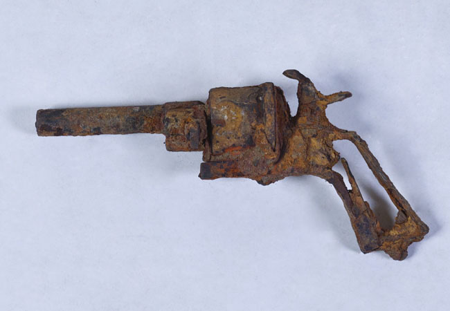 Arma de fuego portátil de mano, con sistema de retrocarga. Compuesto de empuñadura, mecanismo y cañón. Estructura de empuñadura corroída. Cajón de mecanismos oxidado con tambor de giratorio. Cañón recto con base octogonal.