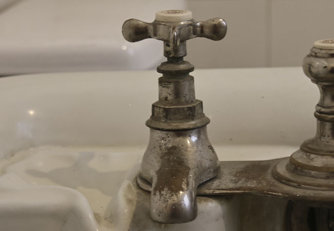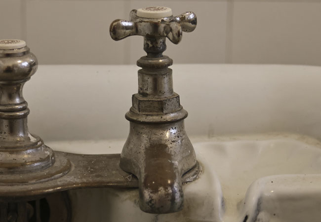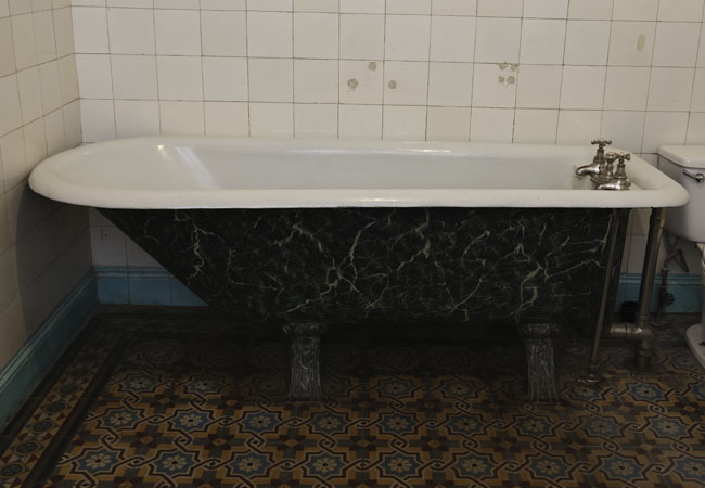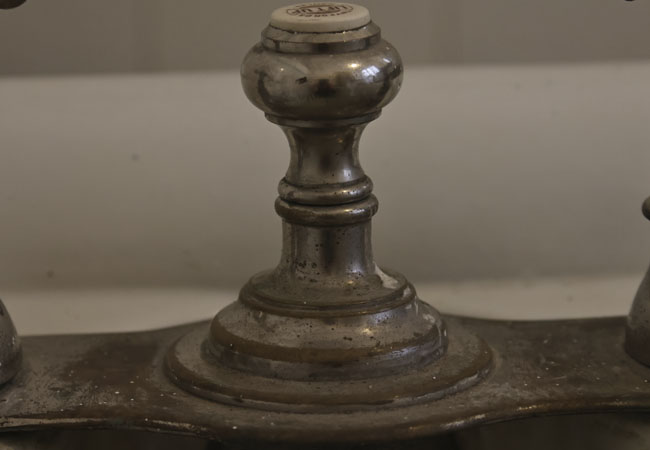 Objeto rectangular color blanco en su interior y negro con manchas en su parte exterior, tiene 4 patas metálicas forjadas y con detalles vegetales. Con su juego de llaves.