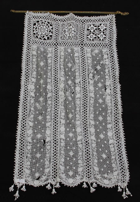 Objeto textil de color blanco translúcido, de malla y encaje, de forma rectangular con borlas en la parte inferior y argollas metálicas en la parte superior.