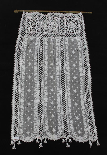 Objeto textil de color blanco translúcido, de malla y encaje, de forma rectangular con borlas en la parte inferior y argollas metálicas en la parte superior.