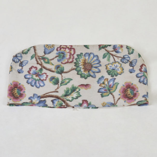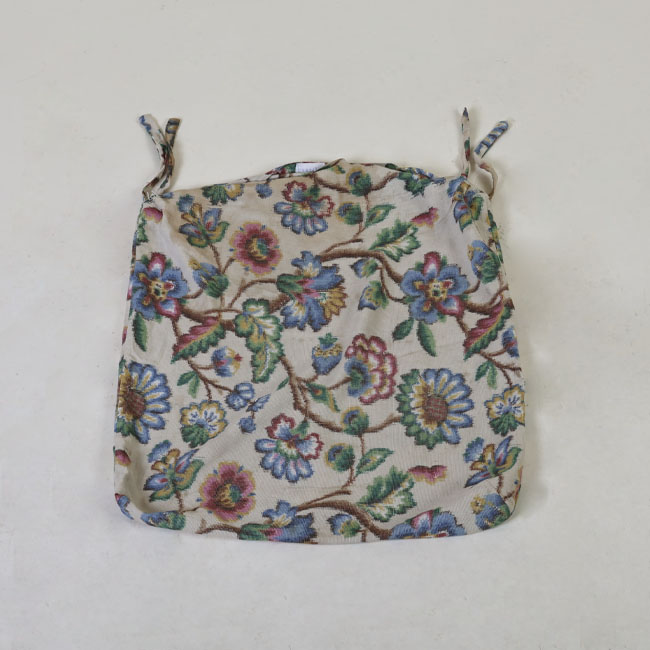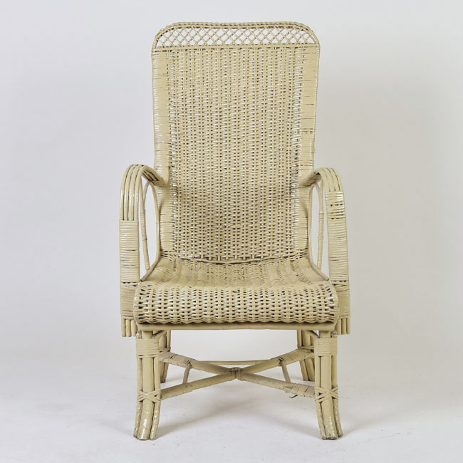 Mobiliario de asiento unipersonal, hecho de mimbre de color amarillo. Consta de base y respaldo tejido, apoyabrazos y cuatro patas arqueadas con cojín y funda en tonos florales.