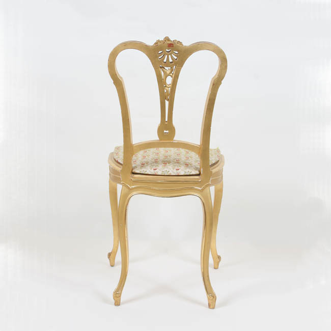 Mueble de asiento, unipersonal,. Estructura de madera, tallada con motivos vegetales y dorada al pan de oro; respaldo calado; asiento tapizado con seda estampada con flores y hojas; cuatro patas tipo cabriolé.