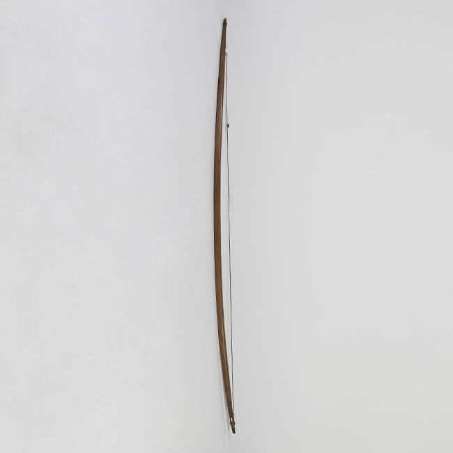 Arco de gran altura compuesto por una vara curva, de color madera, con extremos afinados unidos por una cuerda tensa. La superficie es lisa y alargada, con curvatura simétrica hacia el interior.