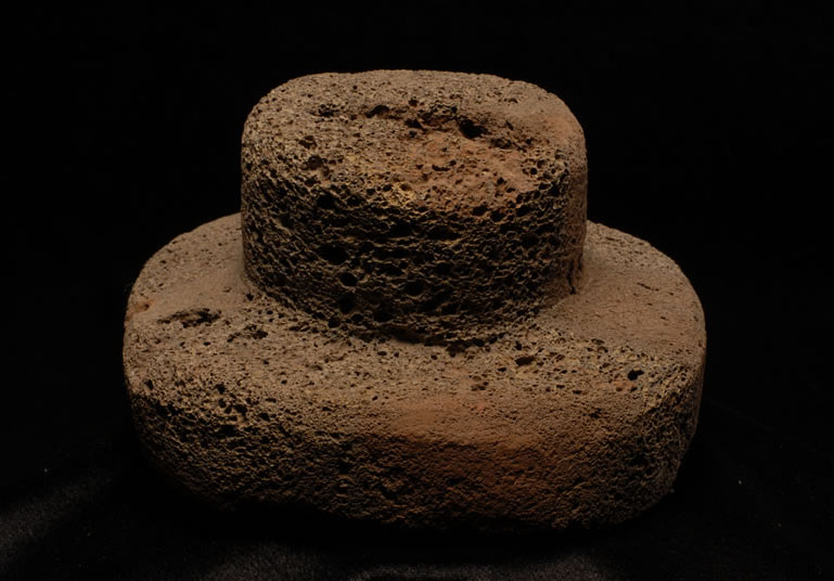 Componente de Moai de piedra que se ubica en la parte superior de la cabeza. Objeto compuesto por dos cilindros, de menor y mayor tamaño respectivamente, y de bordes regulares. Está elaborado en piedra tallada de color marrón rojizo.