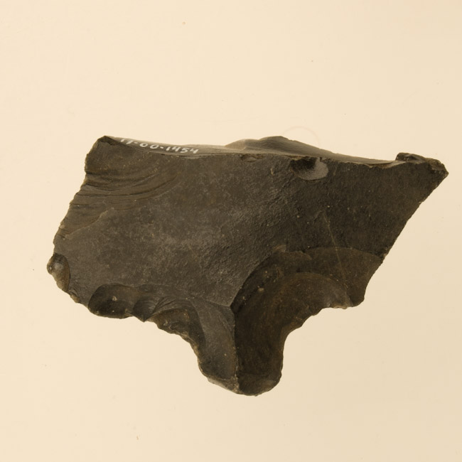 Objeto lítico de forma rectangular, con pedúnculo fracturado a la altura de su unión con el cuerpo de la pieza.