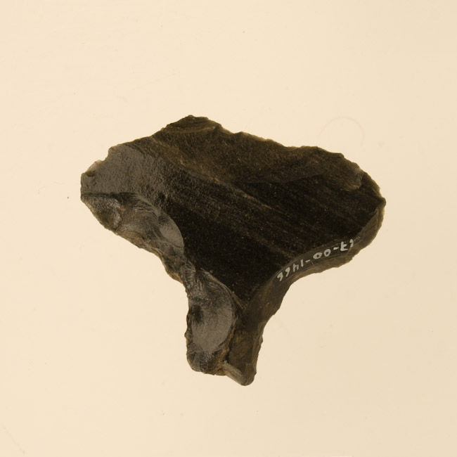 Instrumento lítico compuesto por una cabeza ovalada irregular y un vástago rectangular de extremo recto. Se encuentra elaborado en piedra tallada bifacialmente de color negro.