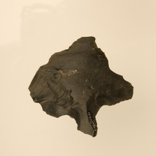 Objeto lítico de forma triangular con pedúnculo. Los bordes y la superficie del cuerpo de la pieza se presentan irregulares. El pedúnculo de la pieza es corto y biselado.