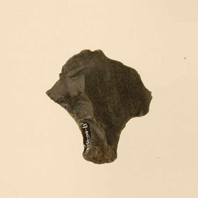 Instrumento lítico compuesto por una cabeza poligonal irregular y un vástago rectangular de extremo biselado. Se encuentra elaborado en piedra tallada bifacialmente de color negro.