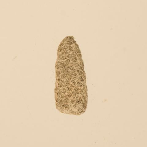 Instrumento de forma cónica y sección semi plana. Presenta la superficie trabajada, y emparejada. Está elaborado en coral tallado de color gris claro.