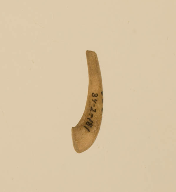 Instrumento de hueso usado para pescar. Fragmento de forma troncocónica curva que correspondiente al fuste. La pieza no presenta escotadura. elaborado en hueso tallado y pulido de color marrón claro.