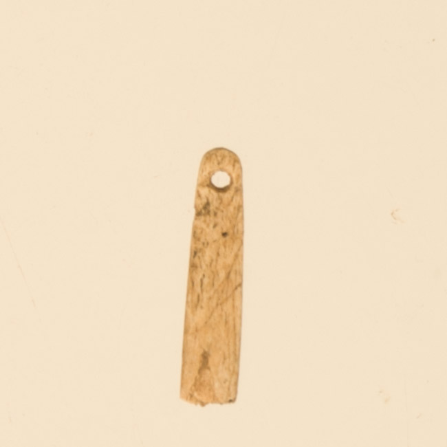 Fragmento de aguja de hueso correspondiente al extremo por donde se pasa el hilo. El extremo de la pieza cercano a la perforación es redondeado. El extremo contrario se encuentra fracturado.