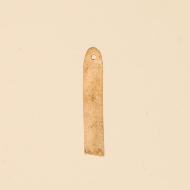 Fragmento de aguja de hueso correspondiente al extremo por donde se pasa el hilo. El extremo de la pieza cercano a la perforación es redondeado. El extremo contrario se encuentra fracturado.