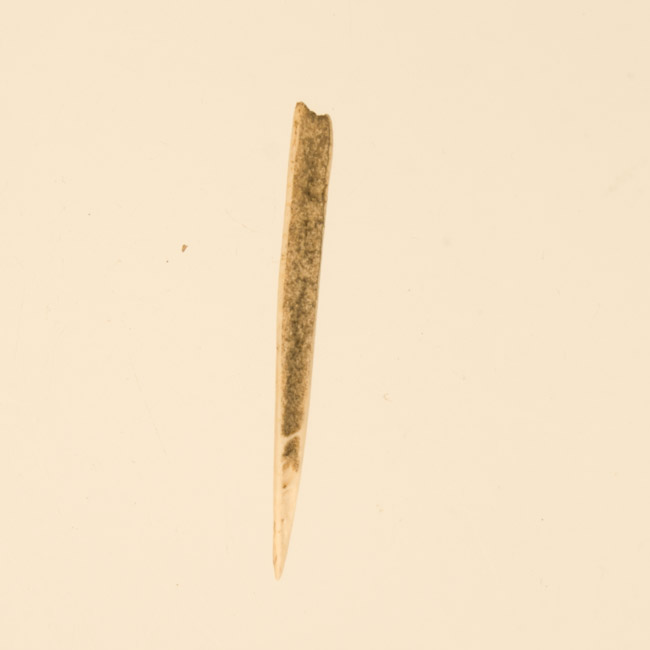 Fragmento de aguja de hueso consistente en la punta del objeto. Se observan bordes convergentes en una punta redondeada.