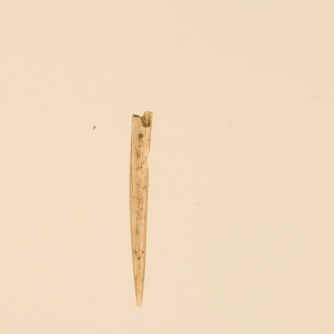 Fragmento de aguja de hueso consistente en la punta del objeto. Se observan bordes convergentes en una punta redondeada.