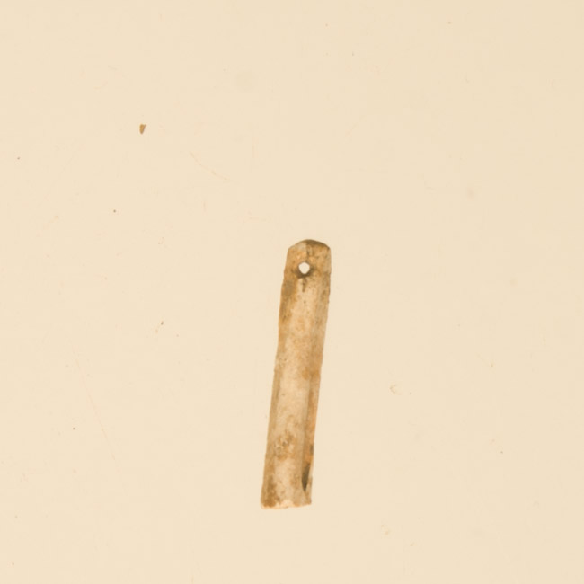 Fragmento de aguja de hueso correspondiente al extremo por donde se pasa el hilo. El extremo de la pieza cercano a la perforación es redondeado. El extremo contrario se encuentra fracturado.