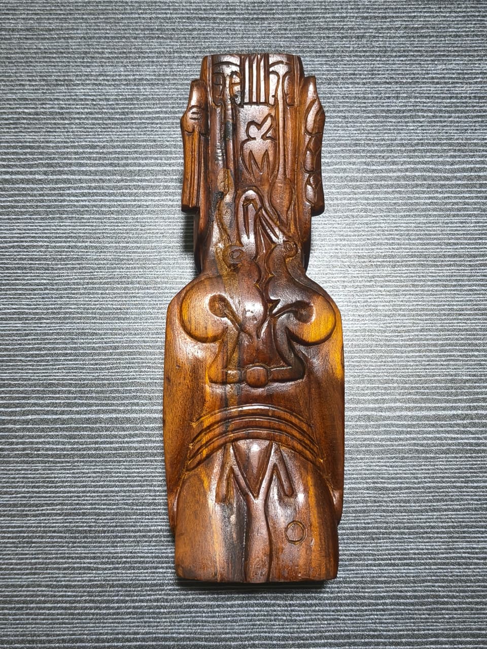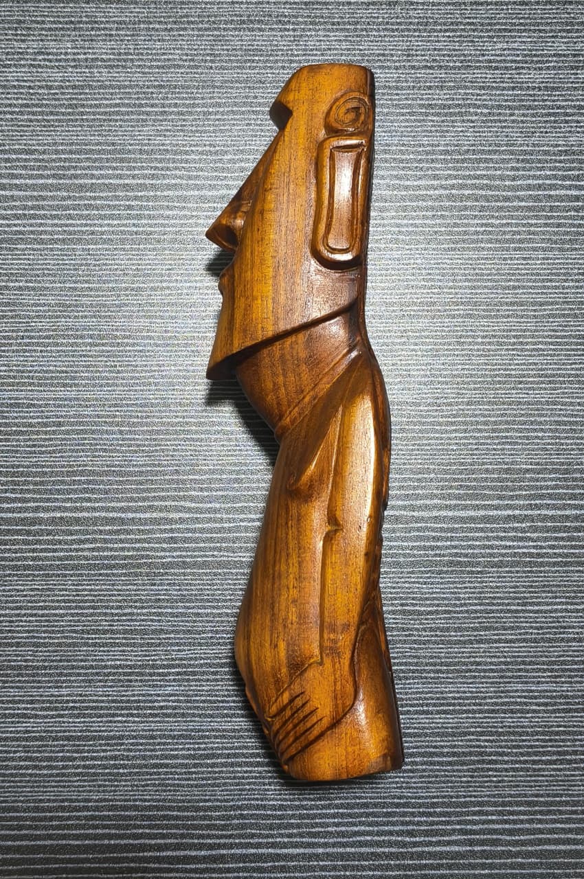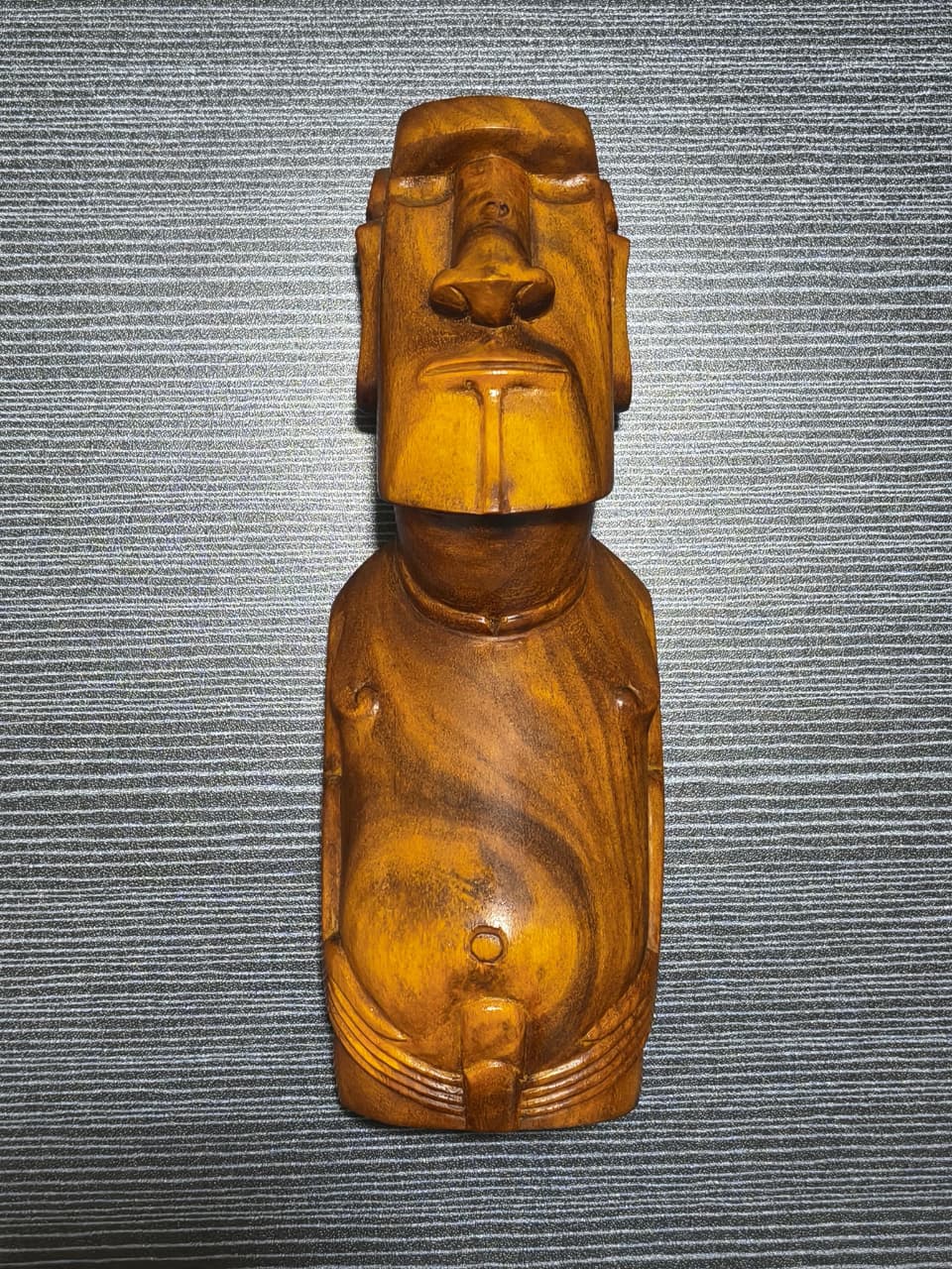Escultura en madera que representa un moai estilizado en busto, con rasgos faciales característicos y brazos en relieve sobre el torso. Excelentes detalles de terminación y pulido.