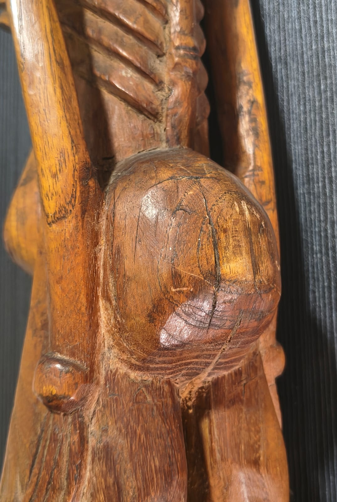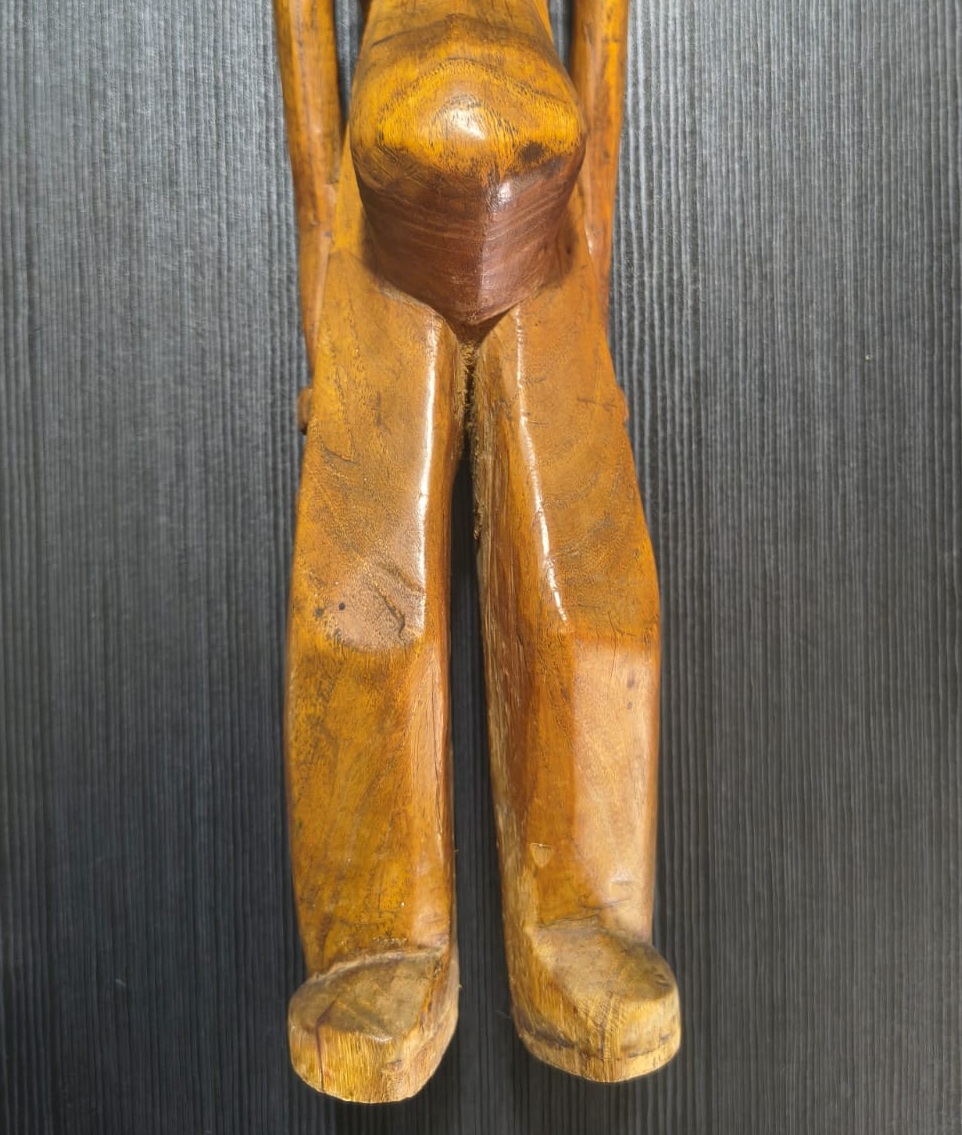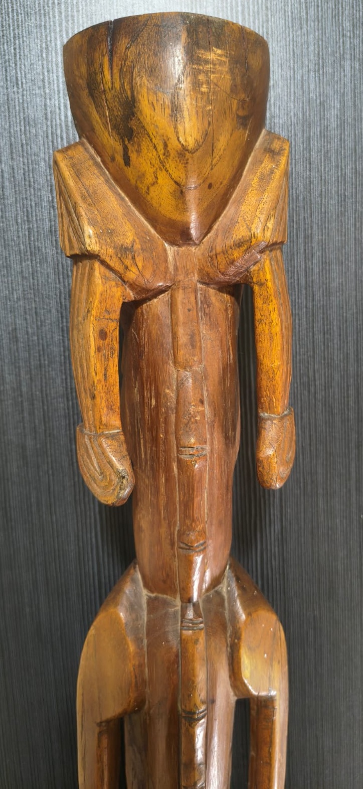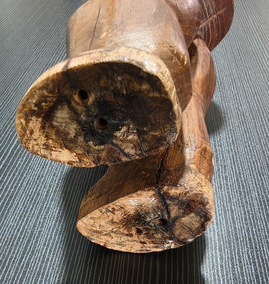 Figura antropomorfa de madera. Posee pómulos y cejas tallados en relieve, ojos engastados de vértebra de pescado y obsidiana, costillas y vértebras conspicuas, y extremidades esquemáticas. En la copa de su tocado presenta una cavidad de 2,5cm de diámetro y 3,5cm de profundidad dentro de una cavidad mayor de 8,5 y 9,5cm de diámetro mayor y menor, y 4cm de profundidad.