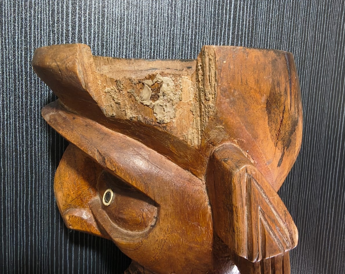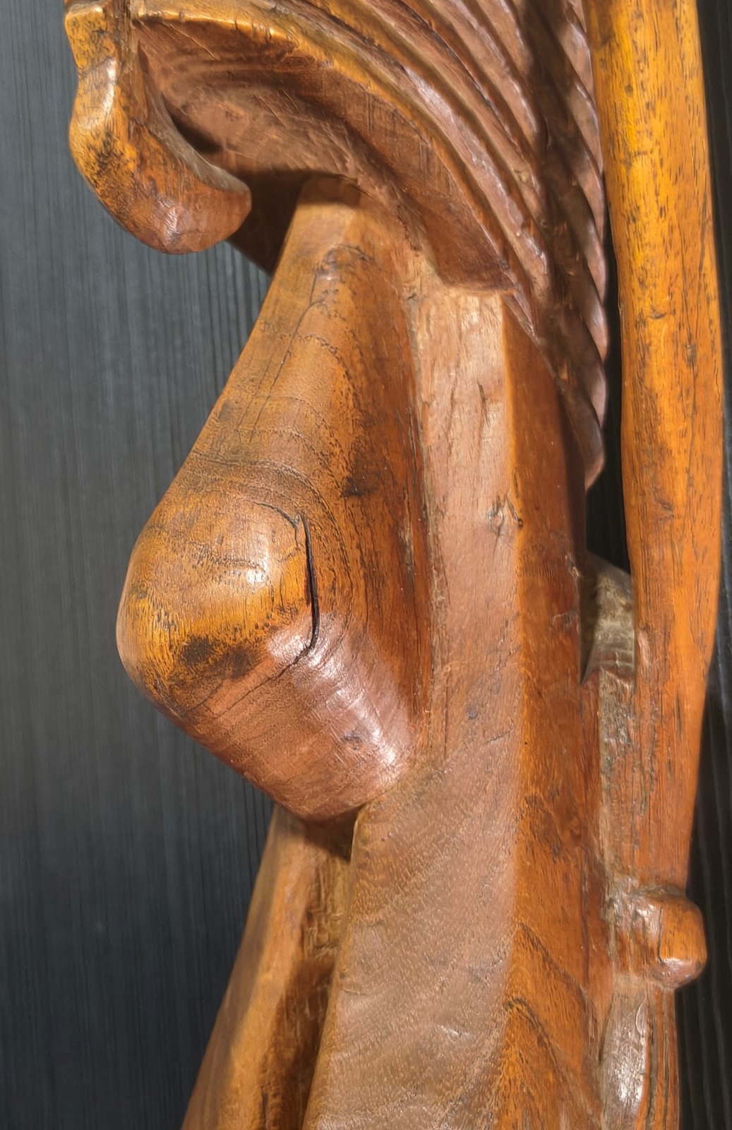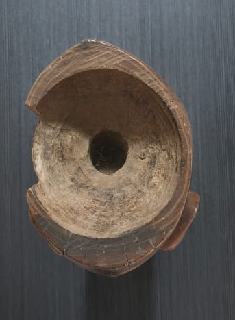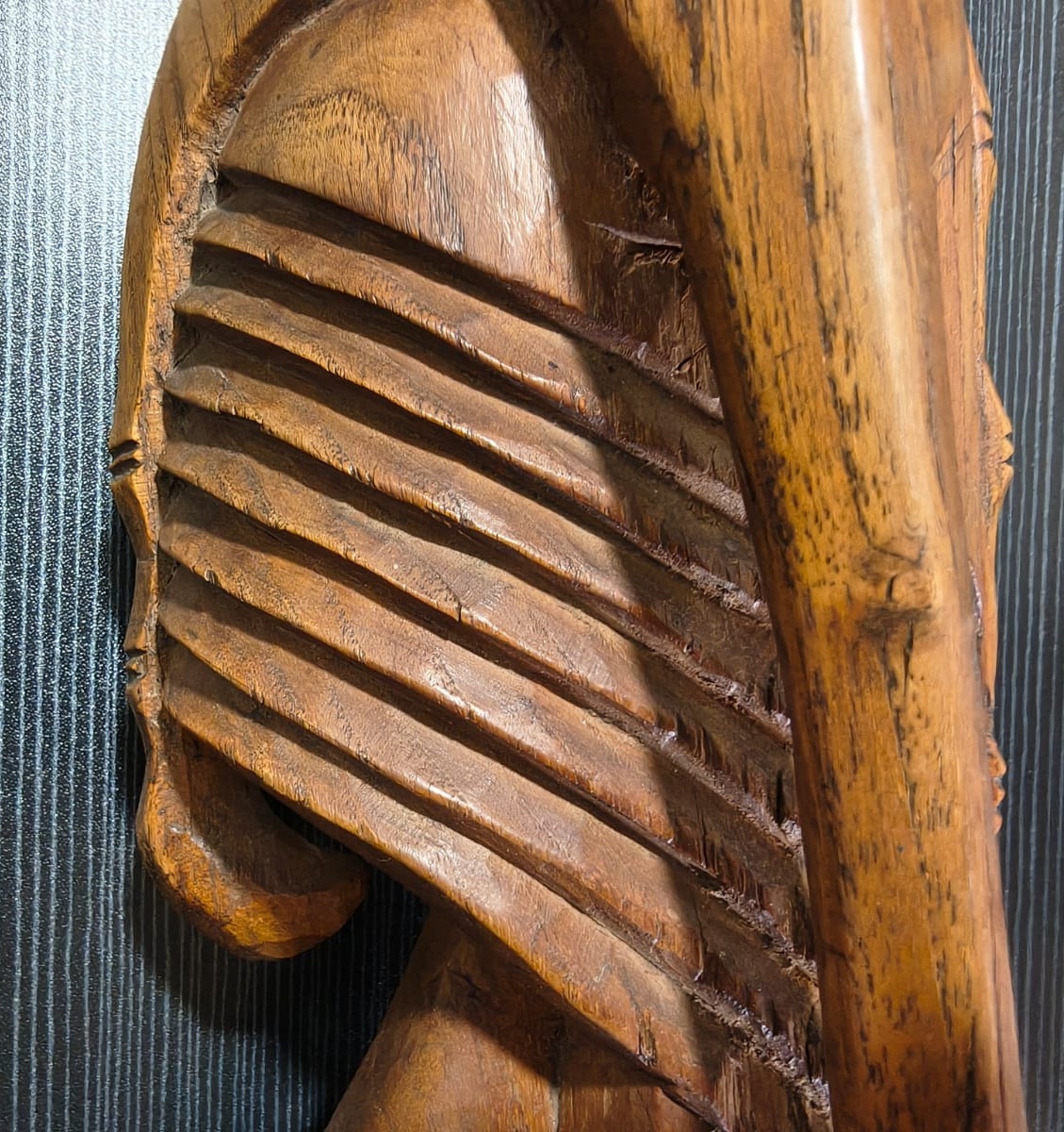 Figura antropomorfa de madera. Posee pómulos y cejas tallados en relieve, ojos engastados de vértebra de pescado y obsidiana, costillas y vértebras conspicuas, y extremidades esquemáticas. En la copa de su tocado presenta una cavidad de 2,5cm de diámetro y 3,5cm de profundidad dentro de una cavidad mayor de 8,5 y 9,5cm de diámetro mayor y menor, y 4cm de profundidad.