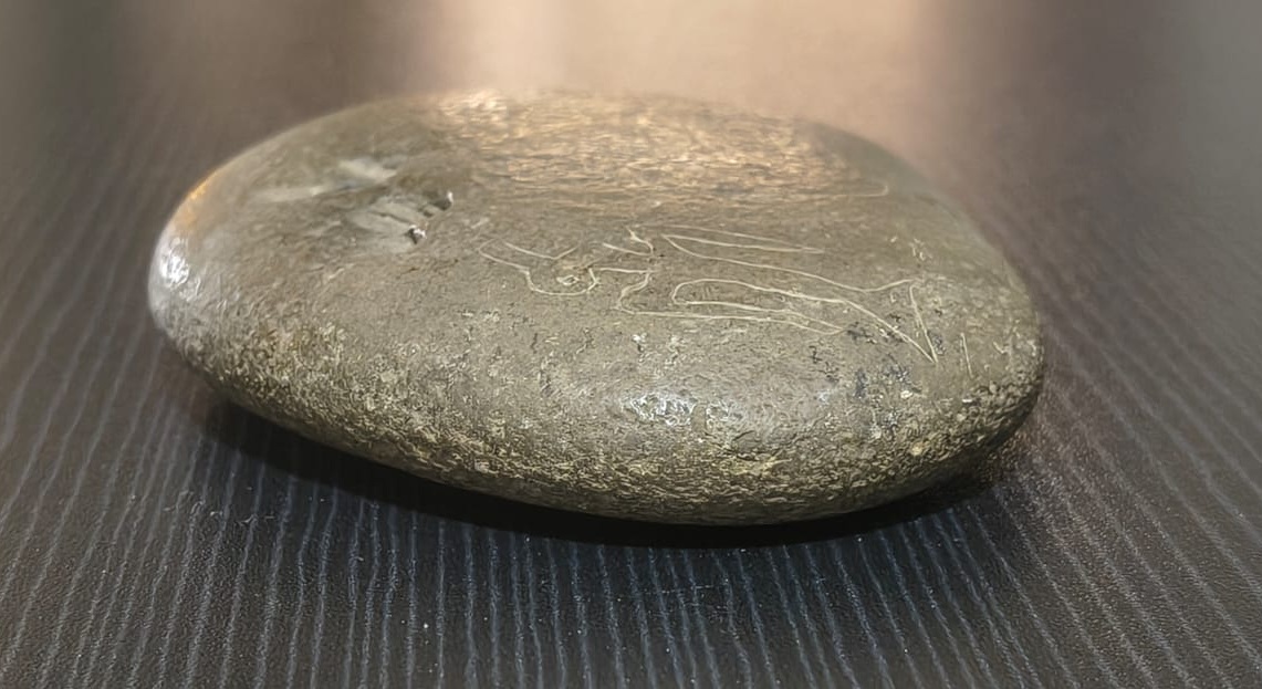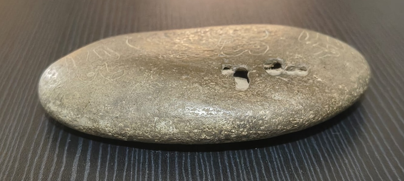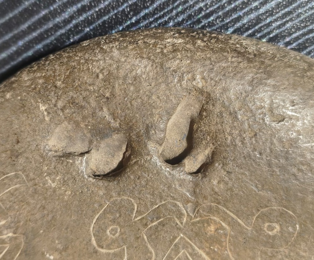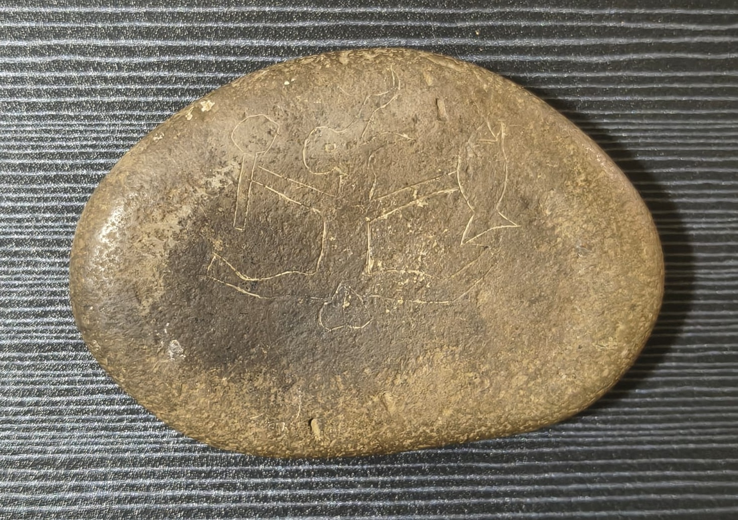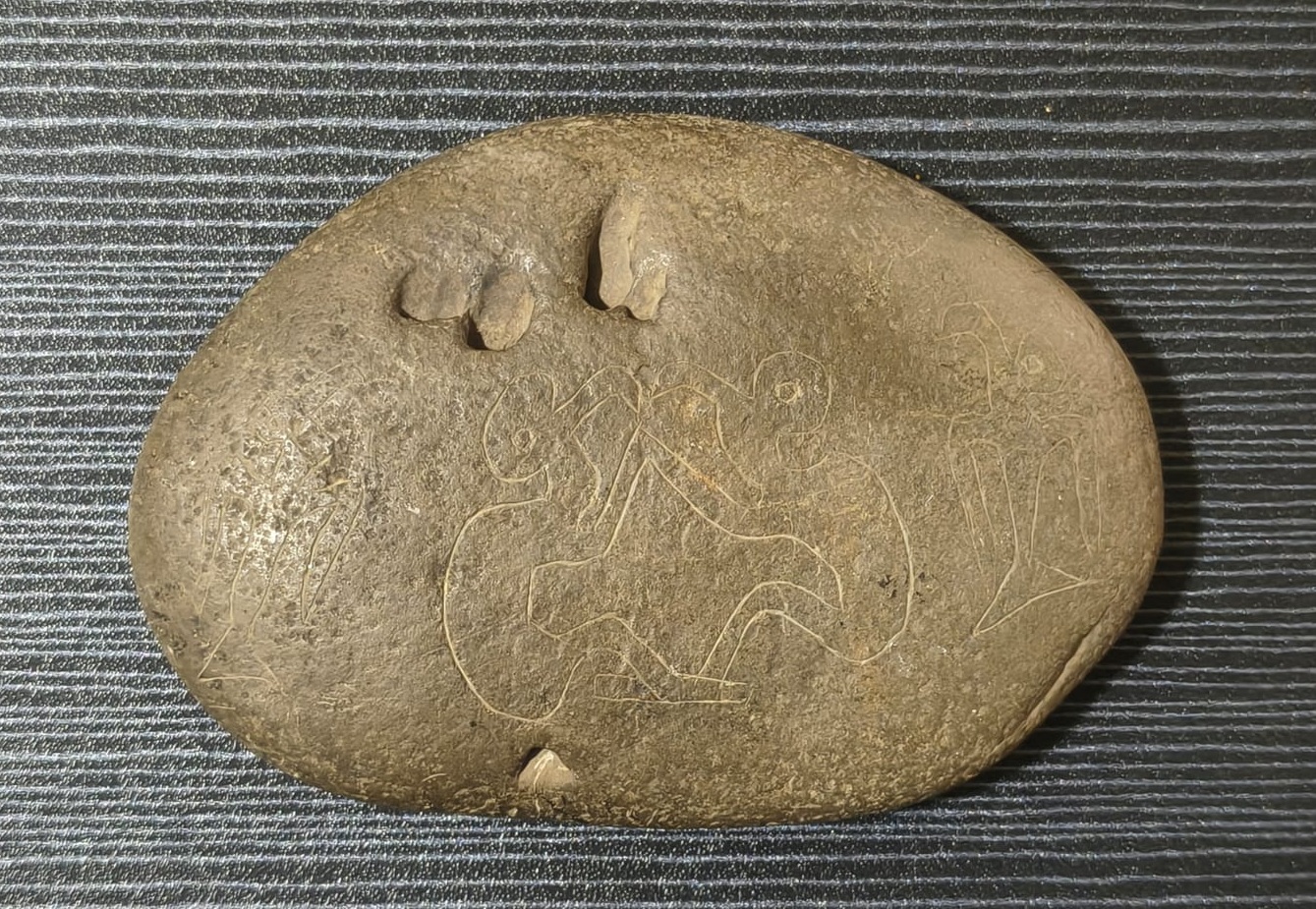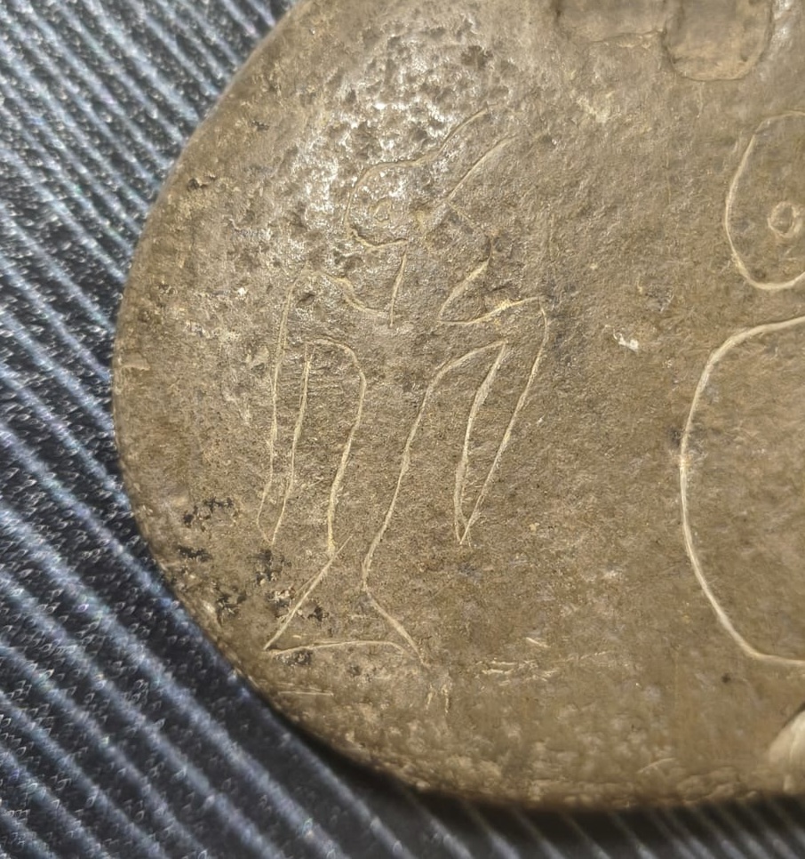 Maea poro, roca horadada relativamente plana con grabados en ambos lados de la roca. Por los costados, la roca presenta abrasión. Por anverso, se obserban 3 grabados, uno central de 2 tangata manu unidos por sus extremidades en simetría espejo, y dos figuras laterales iguales, dos tangata manu mirándose, también en simetría espejo. Esta superficie también presenta 4 orificios naturales. Por reverso, en la parte central se identifica hollín y una figura grabada de un tangata manu con las extremidades extendidas, con un ao en una mano y un pez en la otra. Este grabado es superficial y en secciones apenas se distingue.