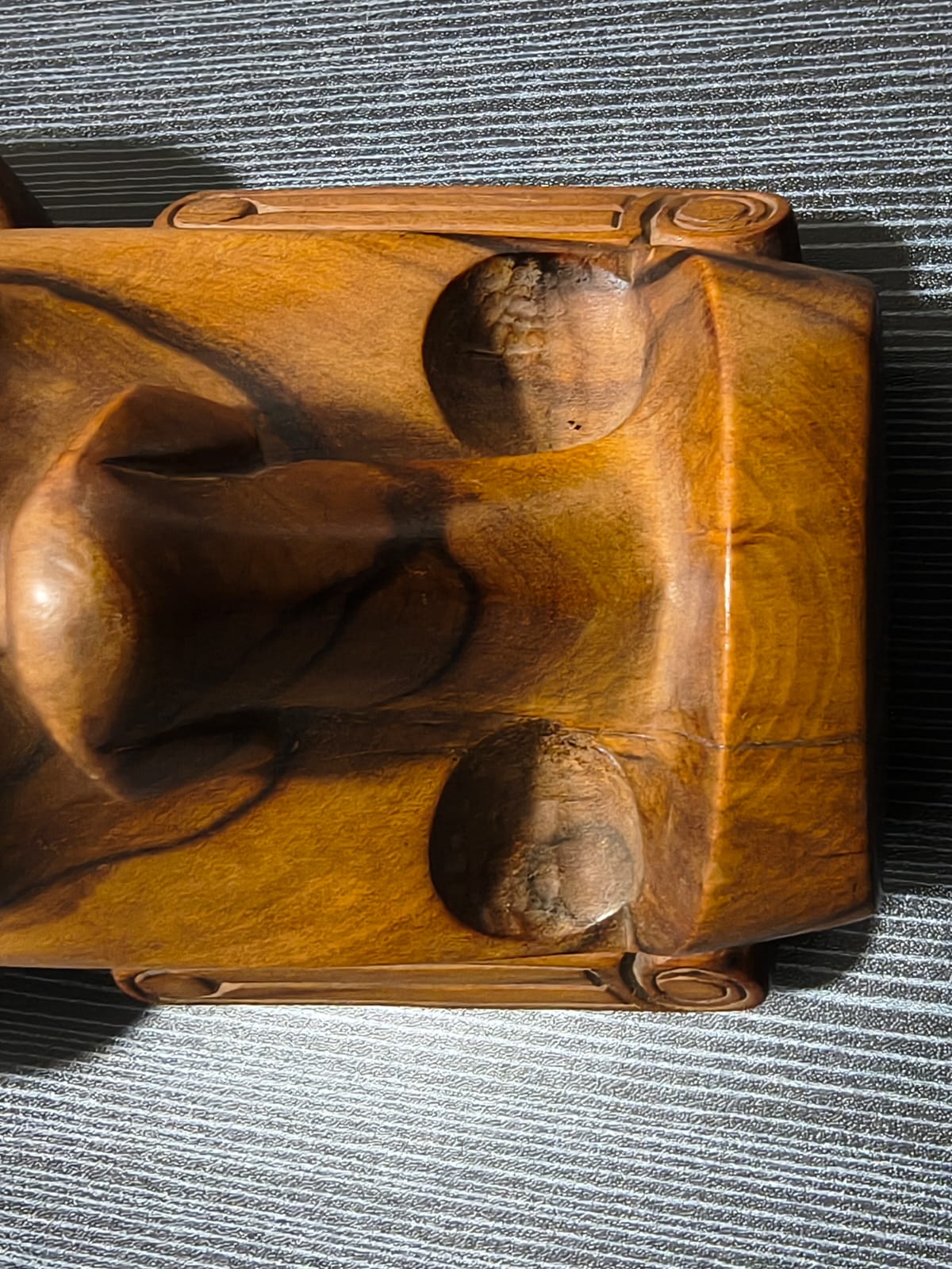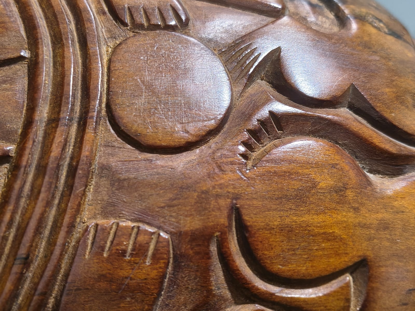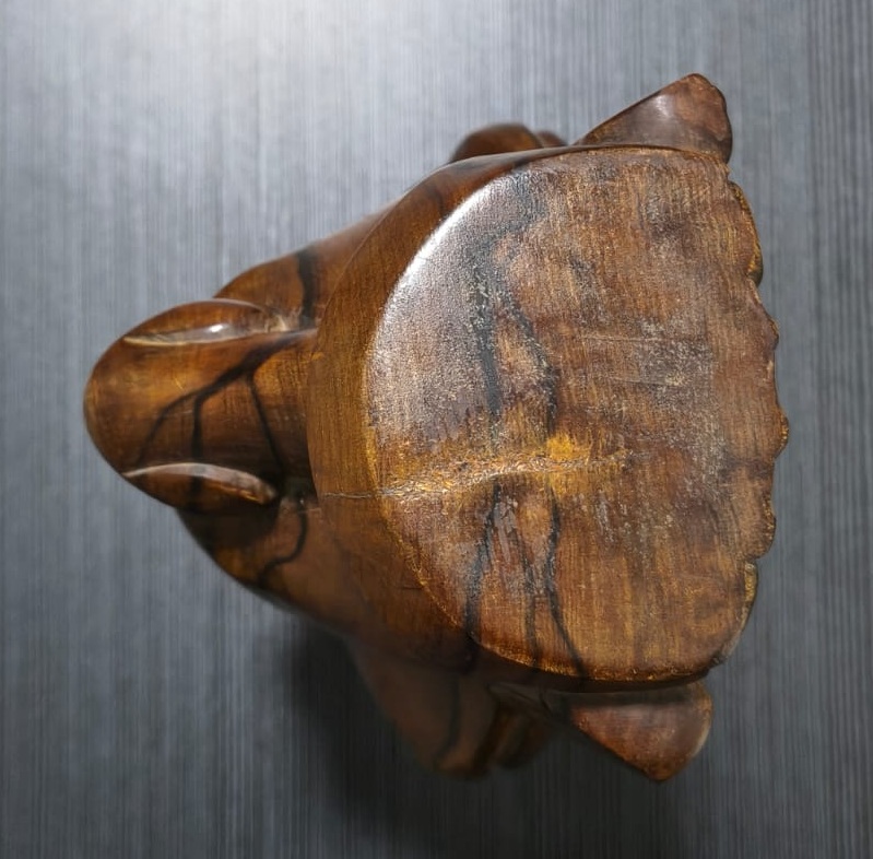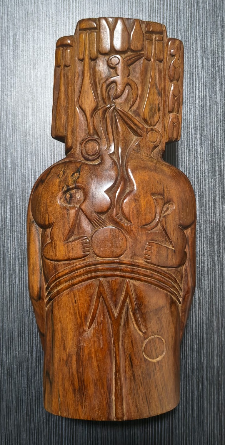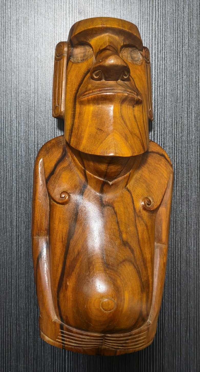 Escultura antropomorfa representa un Moai con las cuencas de los ojos talladas. Los rasgos están bien definidos: nariz, boca, orejas, barbilla, brazos, manos, obmbligo, cuello y tetillas. Presenta 3 espirales dobles: en la cuenca de la nariz, en las tetillas y en las orejas. Sus brazos están apegados al cuerpo, posando bajo el vientre. No presenta tren inferior. Presenta en la espalda y parte posterior de la cabeza, un grabado en sobrerrelieve de trazo grueso, con varios motivos, manutara, komari, arcoiris, Ao, entre otros.