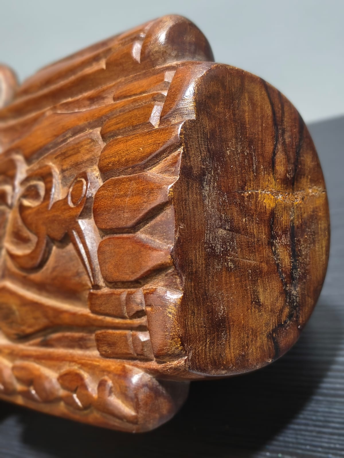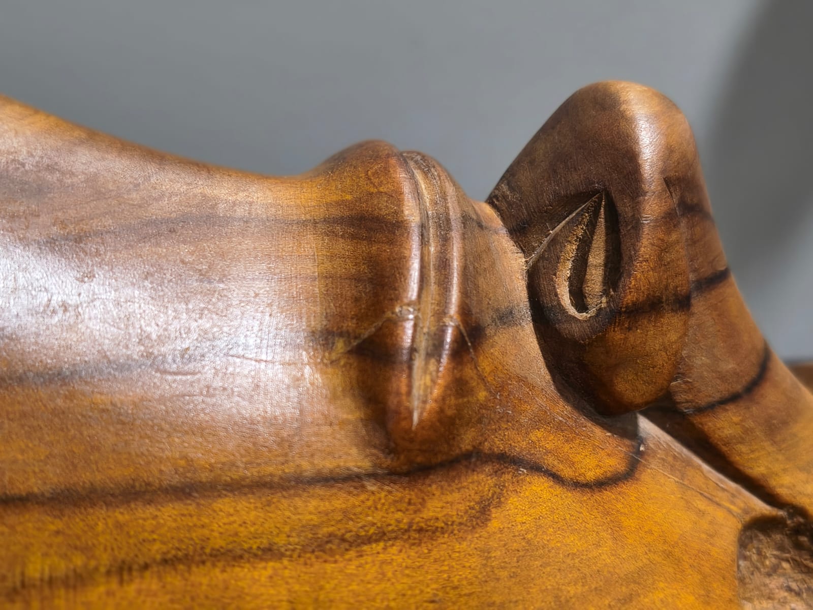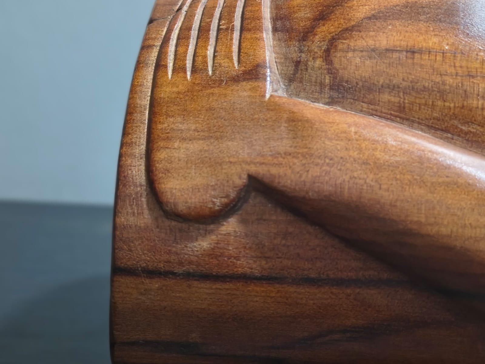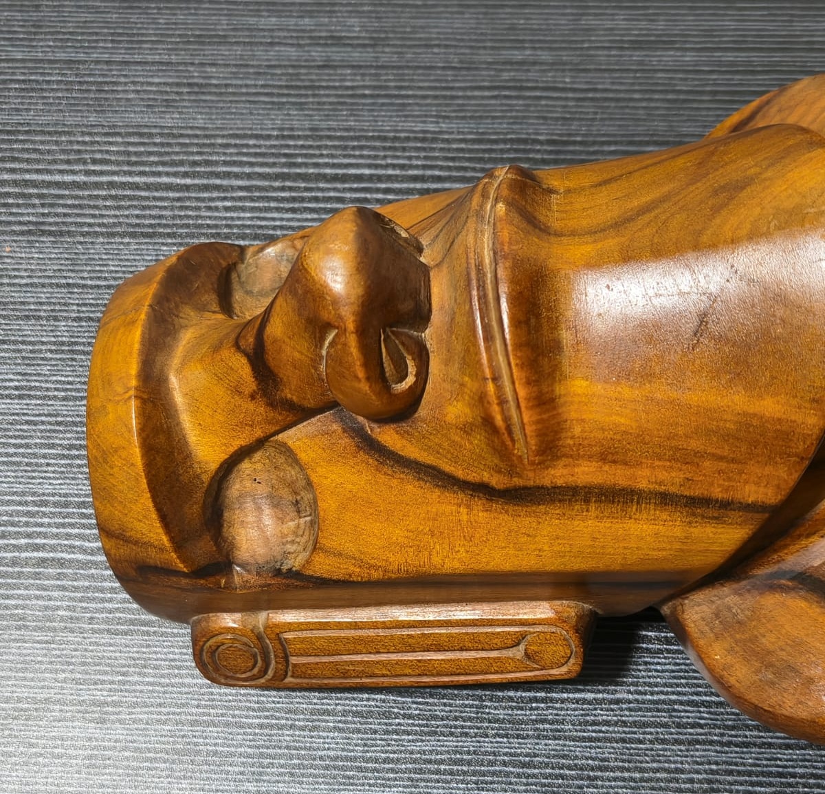 Escultura antropomorfa representa un Moai con las cuencas de los ojos talladas. Los rasgos están bien definidos: nariz, boca, orejas, barbilla, brazos, manos, obmbligo, cuello y tetillas. Presenta 3 espirales dobles: en la cuenca de la nariz, en las tetillas y en las orejas. Sus brazos están apegados al cuerpo, posando bajo el vientre. No presenta tren inferior. Presenta en la espalda y parte posterior de la cabeza, un grabado en sobrerrelieve de trazo grueso, con varios motivos, manutara, komari, arcoiris, Ao, entre otros.