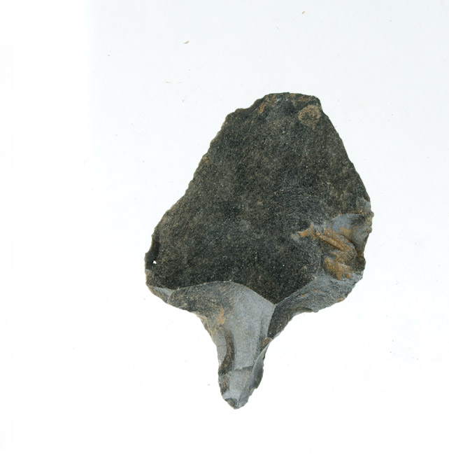 Instrumento lítico de forma general lanceolada. Presenta filos sinuosos discontinuos. Posee un pedúnculo corto, terminado en bisel.