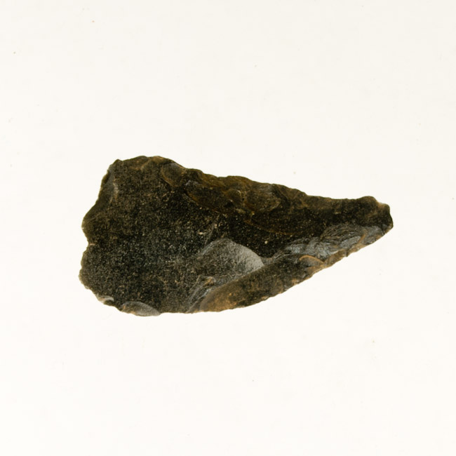 Instrumento lítico de forma general triangular invertida. La pieza presenta sus lados más largos ligeramente curvados, convergentes en una punta redondeada. Se trata de un objeto que no presenta filos ni pedúnculo.
