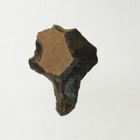 Instrumento lítico de forma subcircular irregular. El pedúnculo de la pieza está terminado en bisel.
