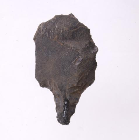 Instrumento lítico de forma general subelíptica alargada, de bordes retocados. Se observa pedúnculo terminado en bisel.