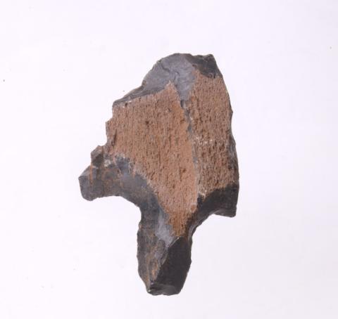 Instrumento lítico de forma general triangular, de bordes irregulares. Se observa pedúnculo retocado, terminado en bisel.