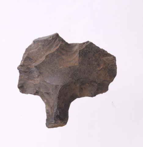 Instrumento lítico compuesto por una cabeza poligonal irregular y un vástago rectangular de extremo biselado. Se encuentra elaborado en piedra tallada bifacialmente de color negro y marrón.