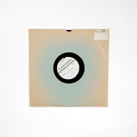 De forma circular de color negro con zurcos. Tiene una etiqueta color blanco y textos color negro y verde con anotaciones con la información del contenido a reproducir y un orificio para la sujeciòn al aparato reproductor. Tiene un sobre color marrón con anotación adherida.