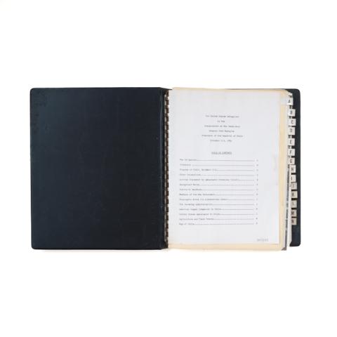 Objeto usado como organizador y contenedor de información protocolar. De forma rectangular. Cubiertos de color negro, tapa con decoración lineal, círculo y tipografía color dorado. En su interior tiene hojas de color blanco y amarillo con tipografía mecanográfica, imágenes impresas y 23 fotografías en blanco y negro. En el borde derecho lleva adherida pequeñas etiquetas con un carácter impreso color negro.