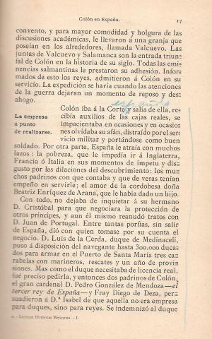 Marcaciones de Gabriela Mistral con lápiz carbón azul al margen de los párrafos de las páginas interiores.
