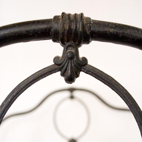 Mueble para dormir o descanzar. Estructura con forma de prisma rectangular compuesto por armazón, cabezaro y piecero. Fabricado en hierro forjado decolor negro y naranja. El cabecero y piecero están decorados con formas florales inscritas en borde lobular.