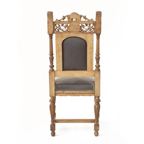 Mueble de asiento individual. Compuesto por una estructura de madera barnizada con barrote superior tallado con motivos vegetales y mondantes verticales torneados. El respaldo y el asiento son de cuero repujado y están tachonados a la estructura. El respaldo tiene estampado un decorado con escudo y las figuras de un cuadrúpedo y ave. Las patas son torneadas, estriadas y van unidas por un travesaño en forma de H.