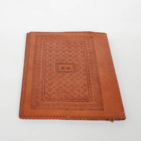 De forma rectangular compuesto por cubiertas con diseños vegetales, geométricos e inscripción. En el interior tiene solapas, una banda de cuero y un compartimento alargado.