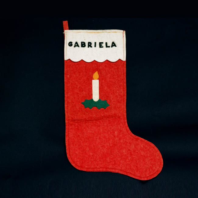 Fabricado en fieltro de color rojo con borde superior de color blanco. En el centro tiene una vela sobre palmatoria de color verde. En la parte superior tiene texto en color verde.