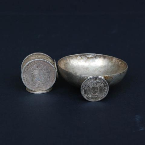 Objeto usado para depositar cenizas. De forma circular cónvavo de metal con dos monedas soldadas en los bordes, tiene estructura formada por cuatro monedas.