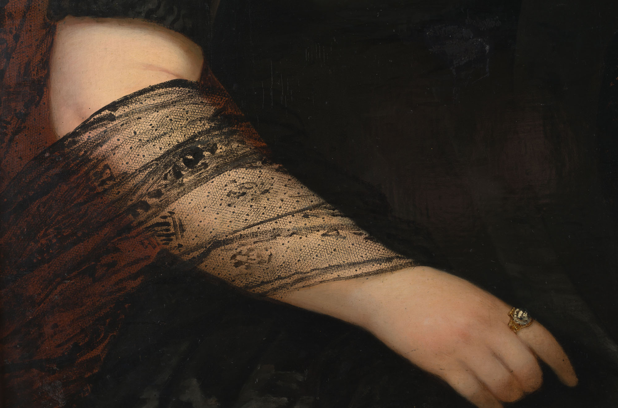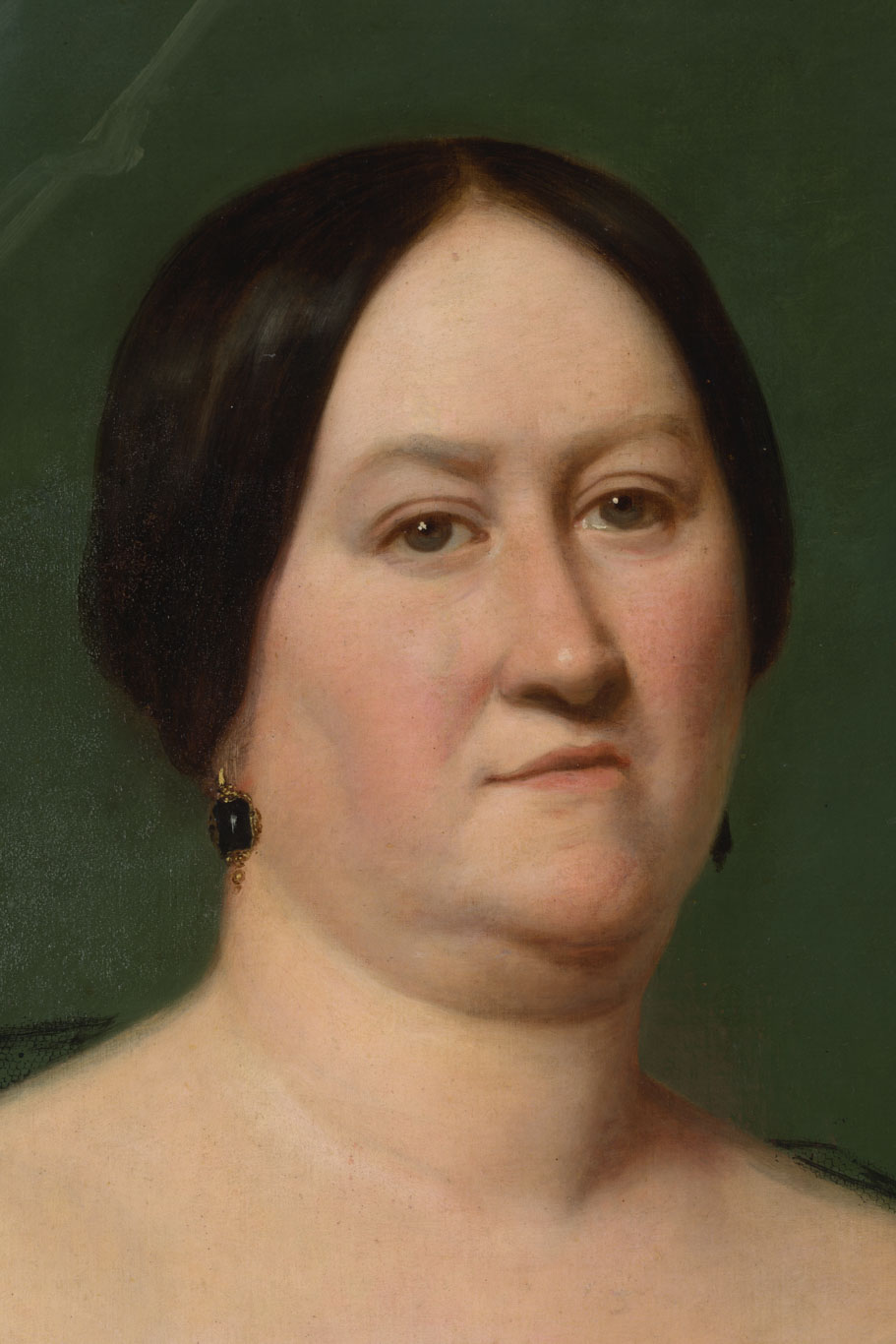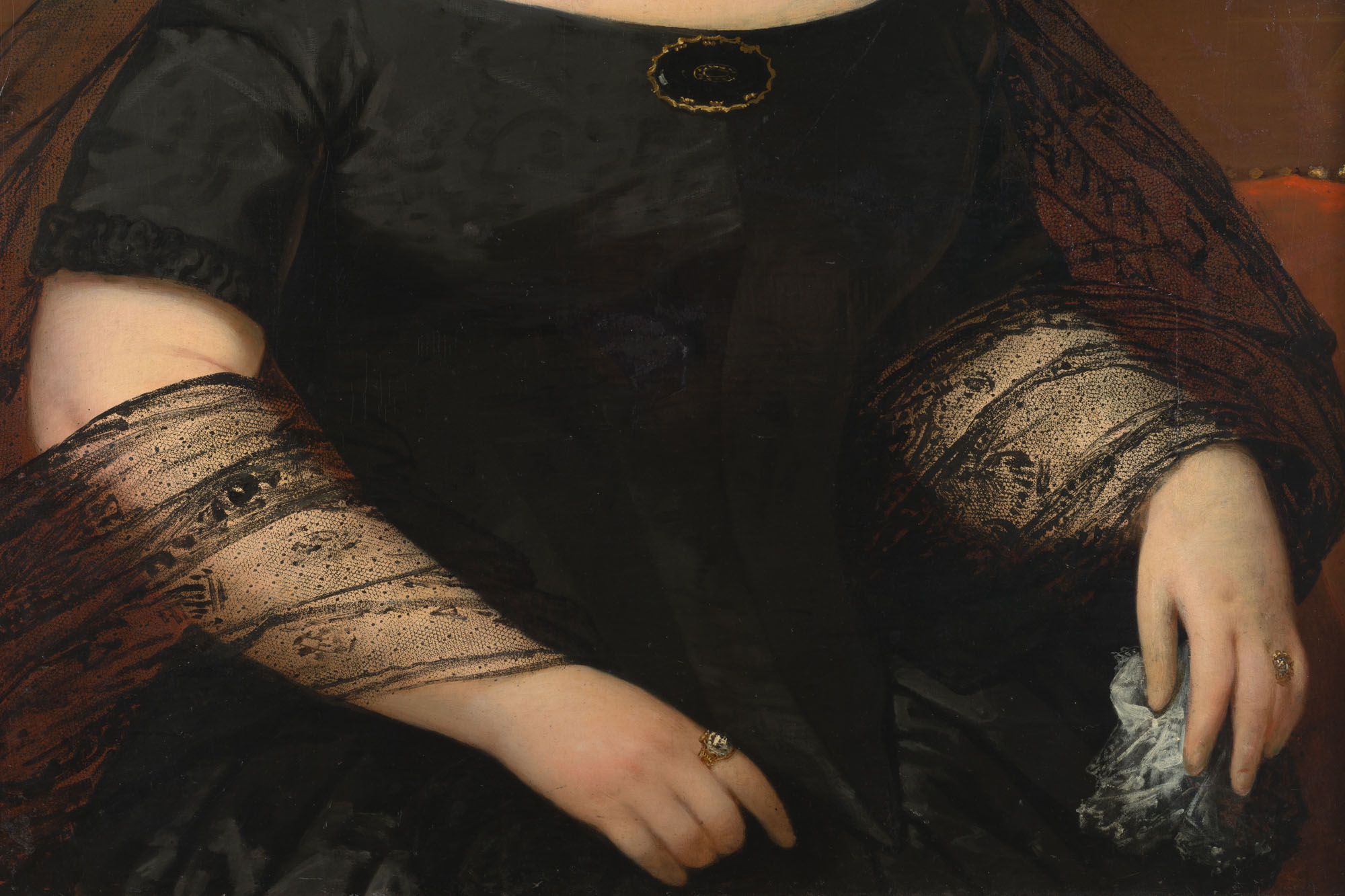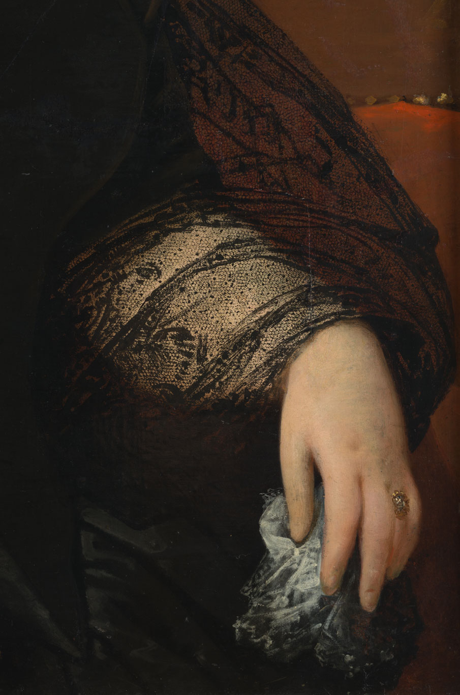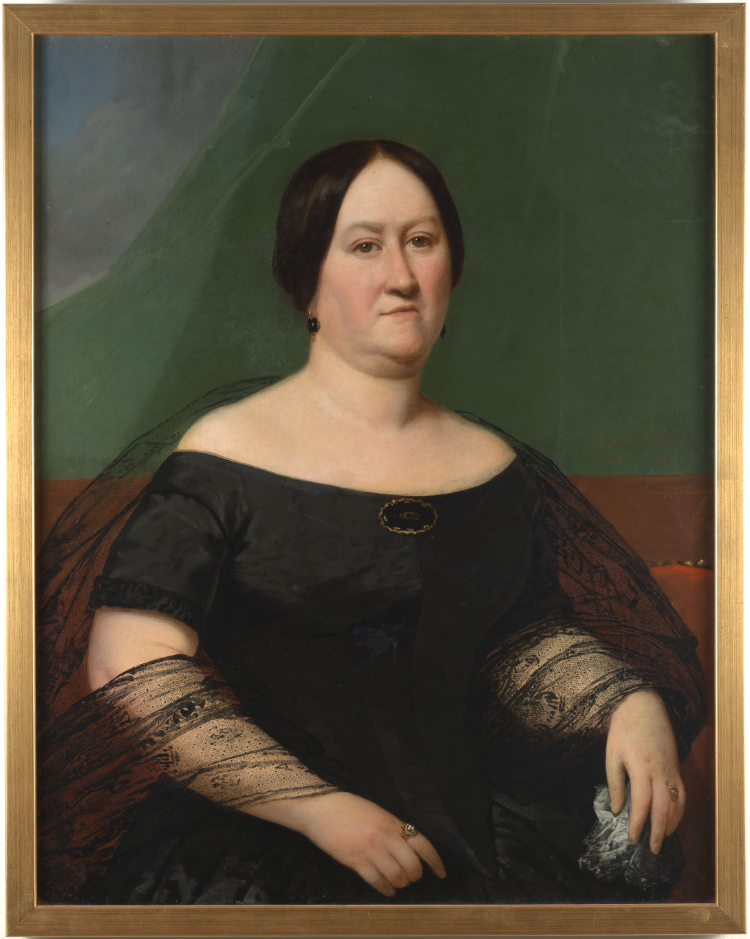 Composición rectangular, orientación vertical. Retrato de una mujer de contextura gruesa, de medio cuerpo, sentada sobre un sillón aterciopelado rojo, sobre un fondo que insinúa cortinaje verde dejando entrever el cielo azul en la esquina superior izquierda. La mujer tiene el cabello oscuro, con partidura al medio y recogido hacia atrás. Lleva un vestido negro con escote barco y broche, y un manto de encaje negro. Con la mano izquierda sostiene un pañuelo de encaje blanco. Lleva pendientes y un anillo en cada mano.