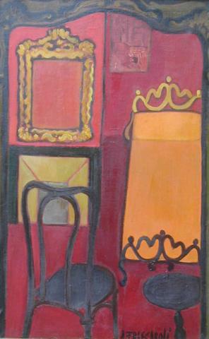 Obra rectangular, orientación vertical. Interior de habitación compuesto por silla negra, marco rectangular amarillo y cama naranja. Fondo en tono rojo. En el borde superior parte de un marco café.