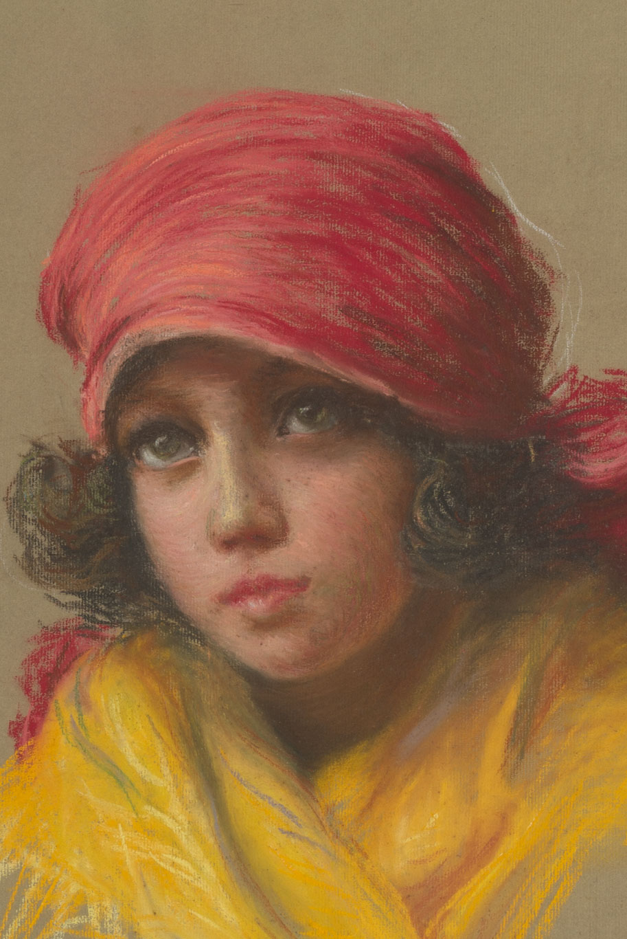 Composición rectangular, orientación vertical. Retrato de busto de una niña, de frente, con la cabeza ligeramente girada hacia la izquierda, sobre fondo neutro beige. Lleva un chal amarillo dorado y un pañuelo de color rojo carmín, bajo el cual se asoma su melena, castaña, corta y rizada. Tiene la tez clara y las mejillas sonrosadas, los ojos grandes y verdes -mira hacia lo alto- la boca pequeña. El fondo es neutro, beige, sin trabajar, lo que confiere a la obra un carácter abocetado.