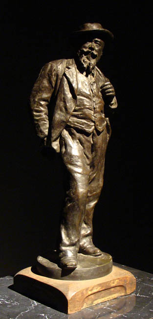Obra tridimensional exenta, se representa el retrato a cuerpo completo de un hombre vestido de traje. Éste, carga levemente su cuerpo hacia la derecha mientras mira hacia la izquierda, en una expresión despreocupada. El hombre de barba larga y edad madura se encuentra utilizando un sombrero.