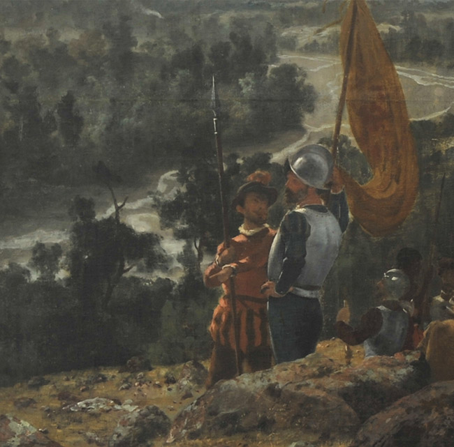 Composición en base a un grupo de figuras masculinas -varios militares, tres indígenas y un religioso- distribuidas en los diferentes planos, en distintas posiciones, con estandartes, lanzas y otros elementos de guerra. Están situados en la ladera y en la cima de un cerro, donde destaca una gran roca. Hacia el fondo, un paisaje fluvial y la cordillera. El cielo ocupa la franja superior de la pintura y está parcialmente nublado.