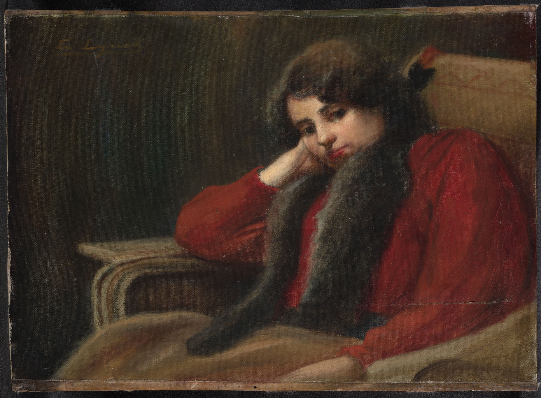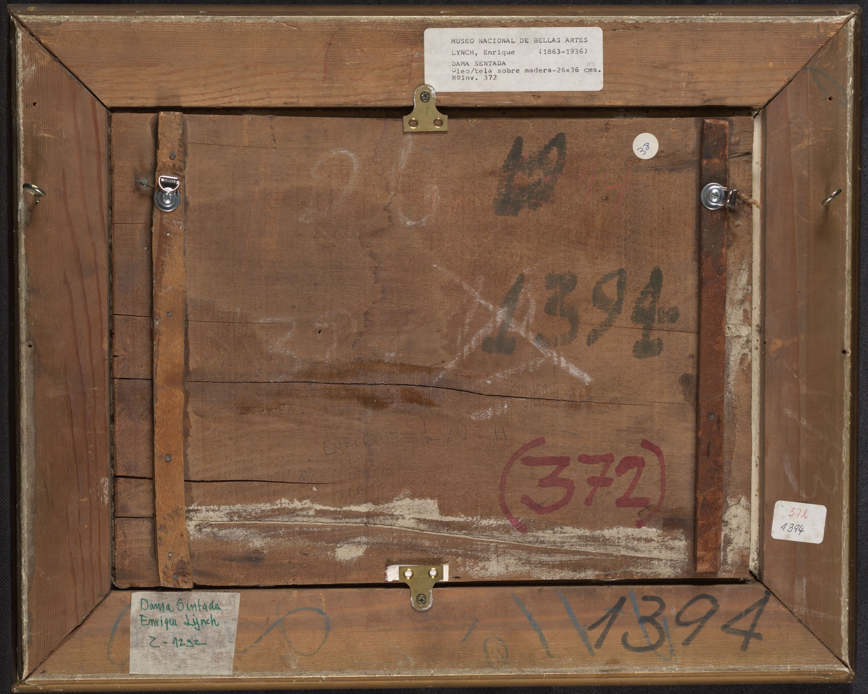 Composición rectangular, orientación horizontal. Retrato de una mujer joven, de tres cuartos, sentada sobre un sillón, de medio perfil hacia la izquierda, mirando a los y las espectadoras. Tiene el cabello castaño y frondoso, recogido; la tez clara, las cejas delineadas, los ojos almendrados, la nariz recta y la boca pequeña, con los labios carmín. Aguanta la cabeza con la mano derecha. Lleva blusa de manga larga de color bermellón, bufanda de pelos que cae a los lados del cuello, cinturón marrón y falda beige. El fondo es neutro, de color verde oscuro. El empaste es delgado, dejando visible la textura de la tela del soporte.