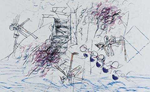 Obra de formato rectangular en orientación horizontal. Dibujo semi-figurativo que representa una escena de exterior, a la izquierda, se observa un personaje suspensión, mientras que al centro y a la izquierda, especies de aspas con rayos.