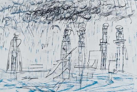 Obra de formato rectangular en orientación horizontal. Dibujo semi-figurativo compuesto por cinco contornos de personajes de pie, sobre ellos una nube negra articulada por medio de la repetición de círculos.