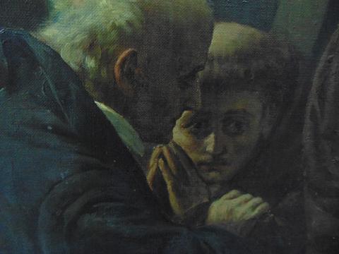 Obra de formato rectangular, disposición vertical. Composición basada en escena religiosa en un interior con varios personajes masculinos en distintas actitudes y posiciones en diferentes planos. En el centro de la composición, en el primer plano, un hombre con hábito marrón arrodillado alzando las manos; tras él, más iluminado, un militar con casco, coraza, mangas amarillas y medias rojas; hacia el fondo, un hombre subido a una escalera y tres personajes colgados de una viga. A los lados hay otros personajes, los del frente pintados de forma más definida que los del fondo.