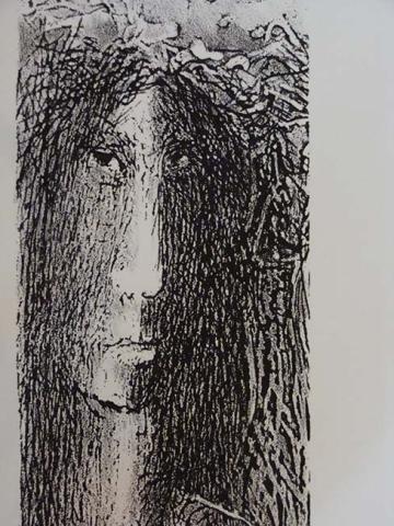 Composición rectangular, orientación vertical. Cabeza humana representada de forma antinaturalista en grisalla, sobre fondo neutro en grises, texturado. Tiene los ojos pequeños y juntos, la nariz larga e iluminada, el cuello esbelto. Destaca la textura de la obra, en base a líneas gruesas en el fondo y delgadas en su rostro.